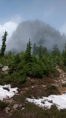 Once we reached the chalet, it was extremely foggy – the hardest part of the hike was finding our way to the Goat Mountain trailhead. We wound up taking a few accidental loops of the grizzly bear enclosure, but once you find the trail it is straightforward. There is a board with maps of the surrounding trails and a registration/permit box. I’d highly recommend filling out a permit since the trail is very steep in sections and a fall/slip could be treacherous.