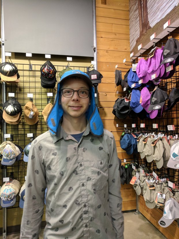 Wearing my sun shirt, trying on some new sun hat options at MEC Calgary while waiting for the Greyhound to go to Pincher Creek