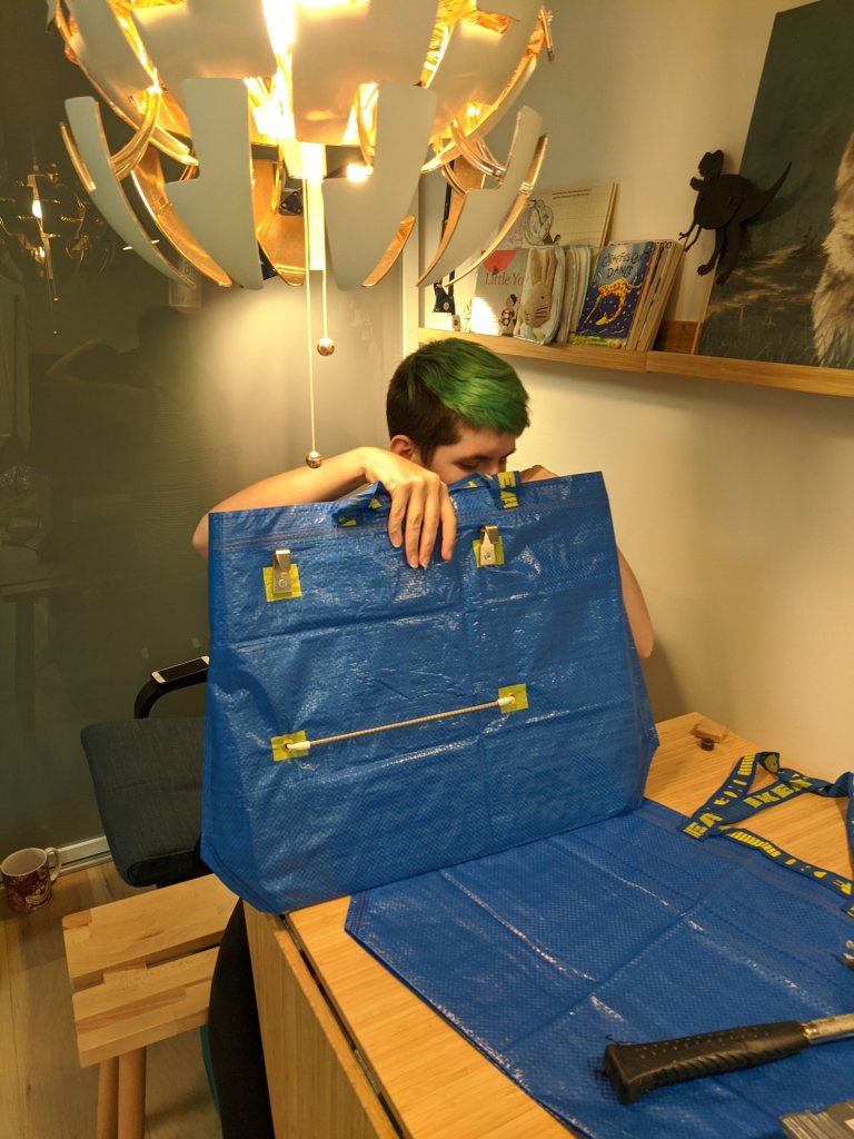 The large holes correspond to grommets installed half way down the bag. All holes in the IKEA bags were reinforced with Tenacious Tape. Grommets were installed through the bag and crazy carpet.