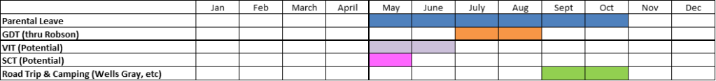 We were considering hiking the VIT with our new baby Toothless in the early 2021 hiking season. We will have time off of work for parental leave which gives us a window of early May to mid June. During this time we are also considering the SCT as a “practice run”; we’ve hiked the SCT in April before so early season hiking is feasible.