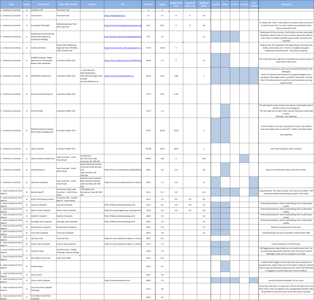 I struggled to tie all of this information together. I was also looking for a way to summarize key locations such as campsites and resupply sites. To close this gap I put the below table together. In doing so, I took some liberties to clarify sections to myself. I named the longer sections that were approximately contained in the PDF maps as Section A, B, C, etc. Although I won’t have clarity on the exact start/ end points for each section until I finish scrubbing through the GPS tracks, I realized in doing this that the numbered sections already provided by the VIT line up 1:1 to my lettered sections. But at least now I can have numbered maps that don’t confuse me with the numbered sections.