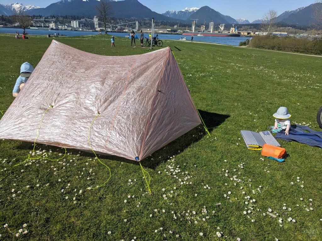 We rode our bikes to the park and set it up with our sleeping pads on a sunny day. Then inspected it, inflated and tested our sleeping pads and introduced Toothless to the tent.