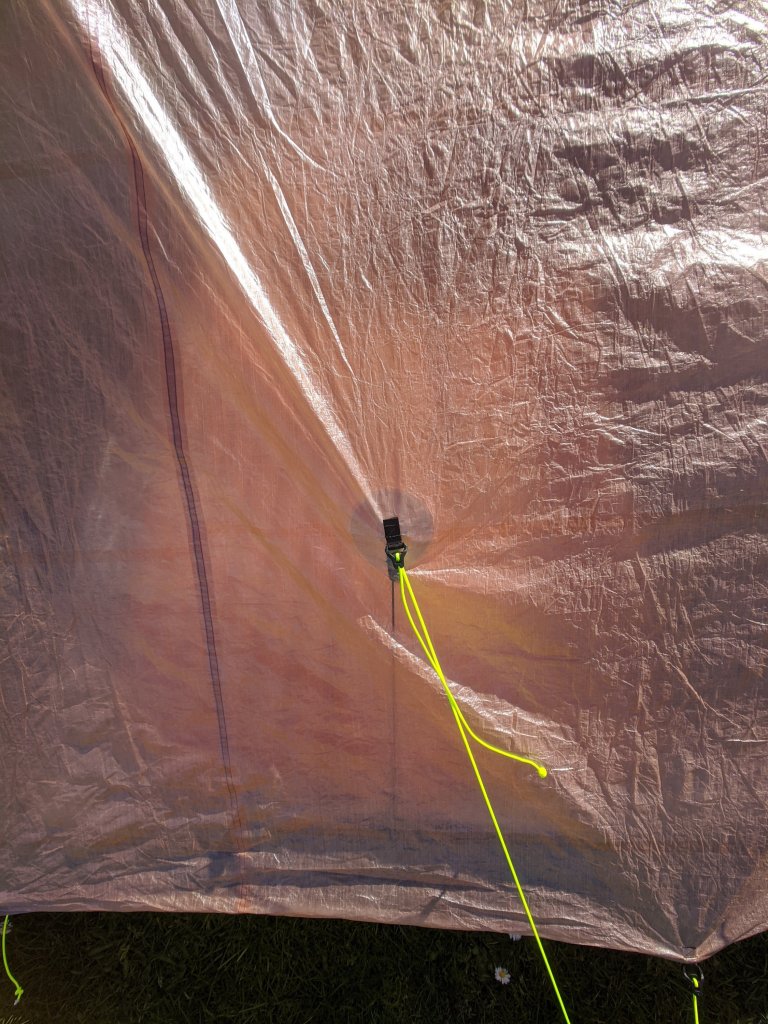 The triplex has more guy lines than the duplex. We are able to use one peg here and it works pretty flat ground, so we may not need extra pegs.