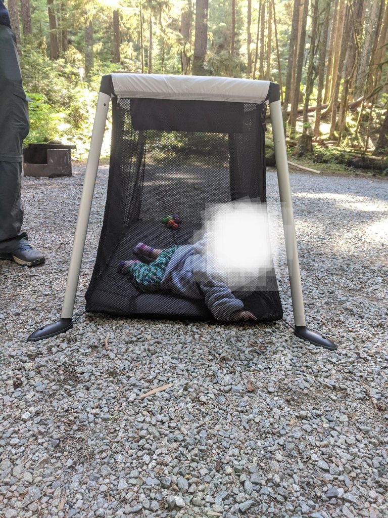 We immediately put him in a travel crib while we set up the tent and unpacked. He was sort of entertained at first and eventually took pleasure in watching us pitch the tent.