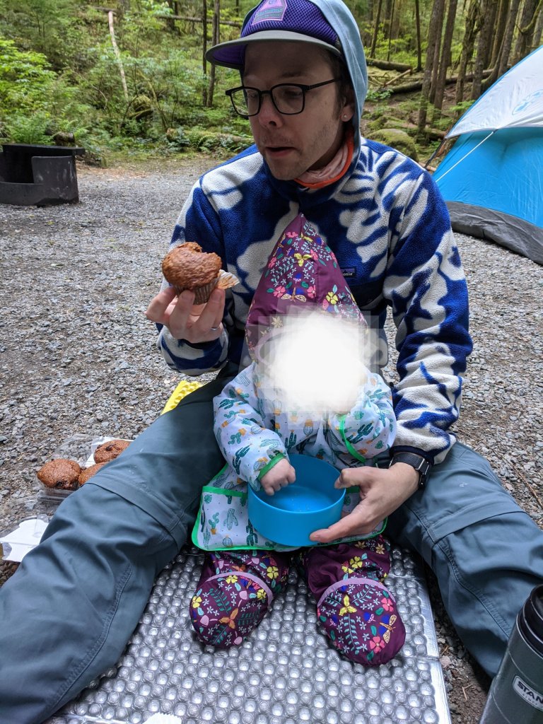 For dinner we found that sitting him on his sleeping pad between our legs was a good way to keep him and the food contained – but obviously getting food on his sleeping pad isn’t a great idea so we will have to rethink this one for backpacking.