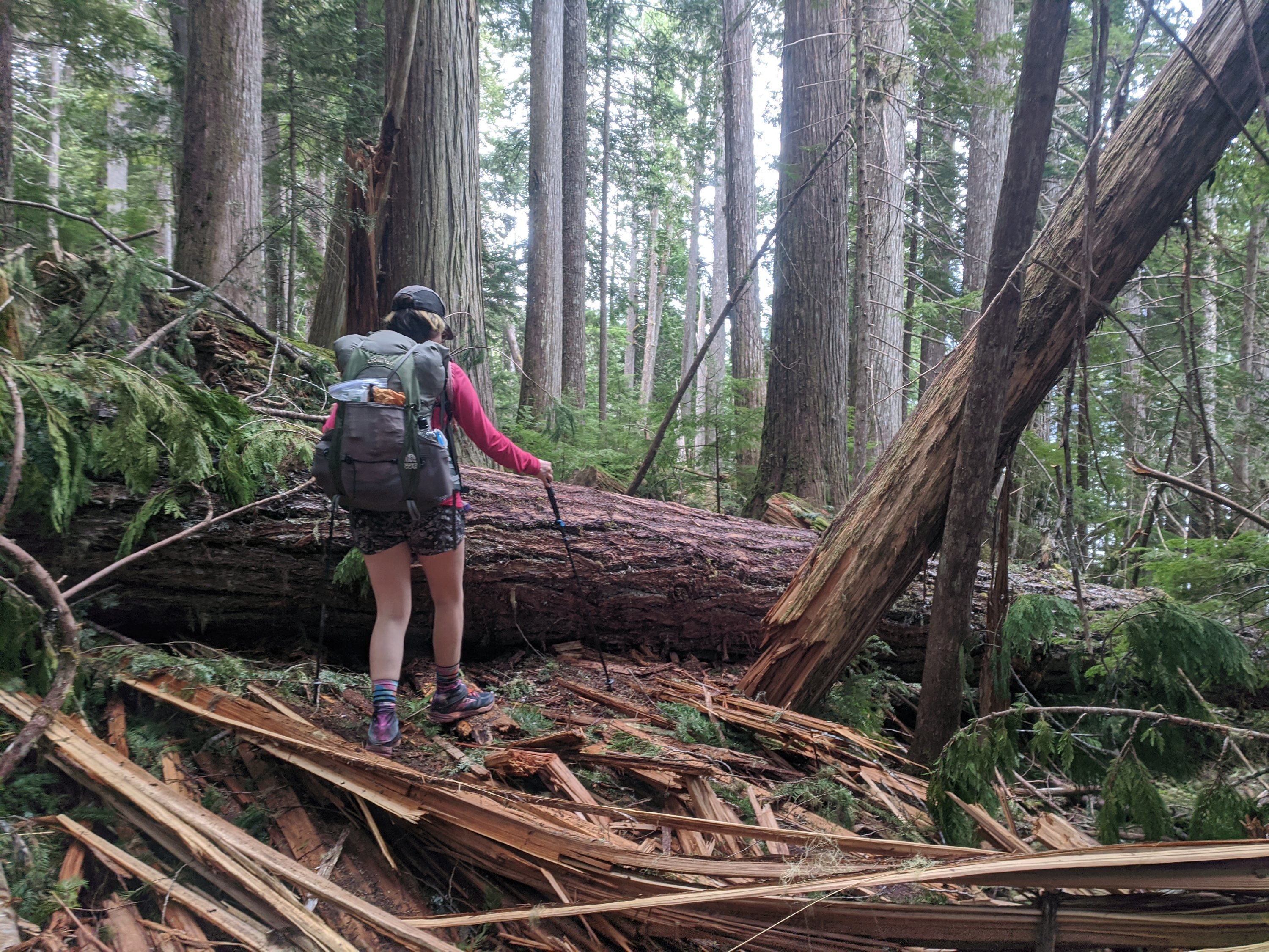 We moved fairly quickly. It was still raining and I had the umbrella clipped onto my pack to keep us dry. I had to take this off to get around some downed trees but for others I could manage with the umbrella out.