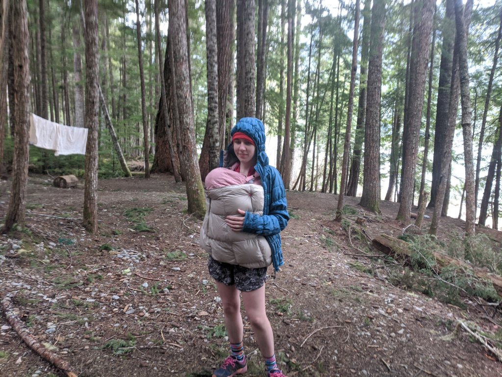Bedtime was challenging. It started raining at dinner and at bedtime it picked up hard and turned to snow and hail. Toothless was stimulated by the rain and hail on the tent, he isn’t very used to sleeping next to us (in fact, being next to us in bed is his morning waking up routine). He barely slept. We ended up taking his sleeping bag off him and co-sleeping with him on our sleeping pad between us partially underneath the quilt. This really is not ideal as it’s not the safest arrangement for sleep. He also liked tugging on the blanket and I didn’t have much blanket to begin with so I was cold most of the night. Ultimately we got very little sleep.