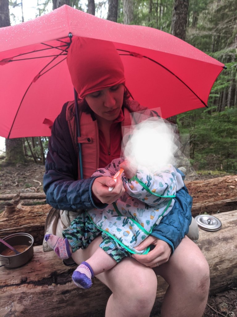 Dinner was very productive! We had beans and rice and Toothless loved it. The hiking umbrella kept him dry while he ate. Our modified bib (we added velcro as a closure) was really easy to use and held up. It would have been better to have two spoons – we find at home he likes holding a spoon and is reluctant to give it up. So having two spoons lets us trade him his empty spoon for a full one and keeps them from falling on the ground.