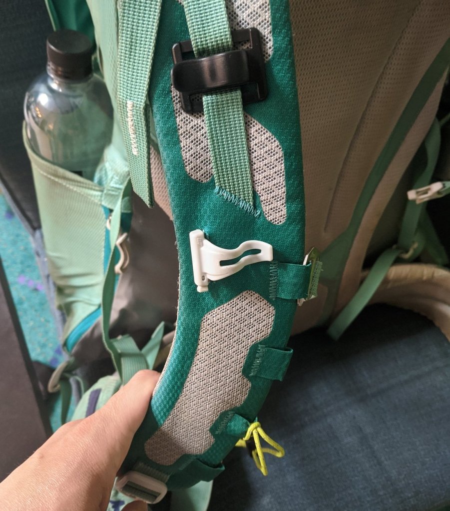 Like the Arc Haul, I used a water hose clip on Natasha’s Gregory pack. The pack already has a clip so I added a second one in the alternate direction. The two clips keeps the umbrella from moving side to side.