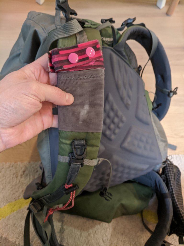 For Natasha’s pack I had nowhere to put the water bladder clip so I used an old elastic headband and added plastic snaps to hold the umbrella. A (red) cable and toggle was looped further down to hold the umbrella handle.