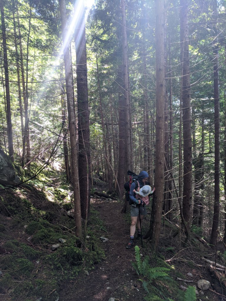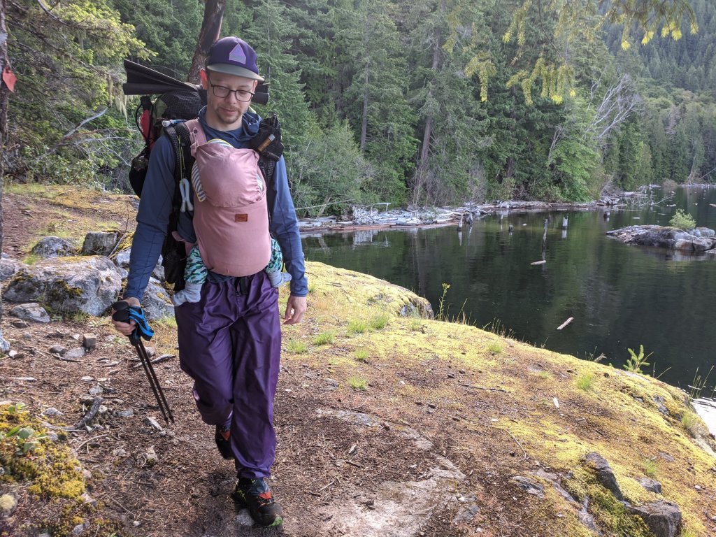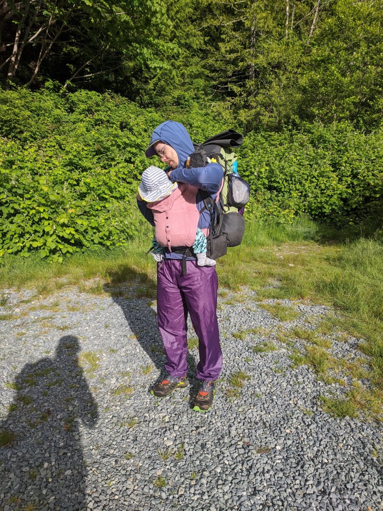 The hike was hard at first! I (Kyle) had started out carrying Toothless who immediately fell asleep and was dead weight. His head pulls back on his nap hood which pulls on your shoulders and is quite painful.
