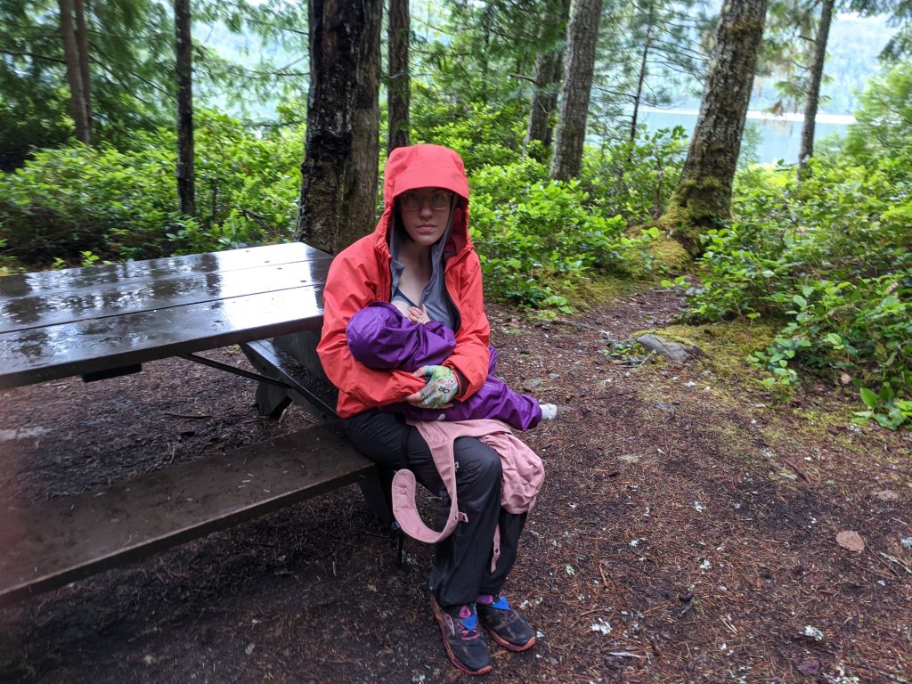 We set off in our rain gear… and the rain immediately stopped. A few kilometres around the lake and we reached the Inland Lake car campground and took advantage of their washrooms and garbage cans and then took off everyone’s rain gear before continuing on.