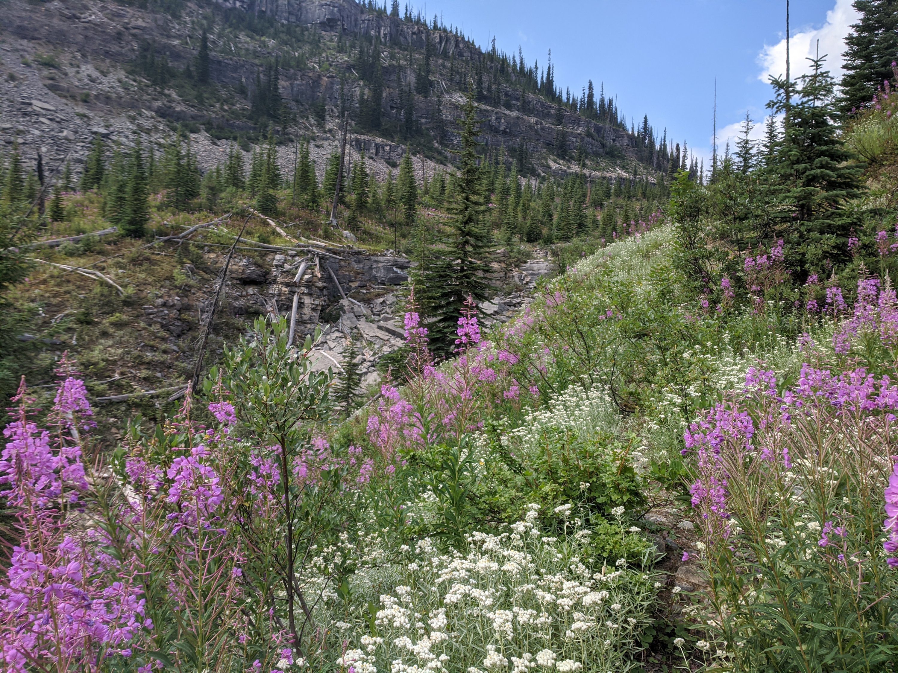 The final ascent to the pass is pretty fun with pretty waterfall-ish rocks on the left, though there was no water flowing on them today. We still had a bit further to push after we finally reached the pass as we were doing the Amiskwi Ridge Alternate and needed to reach the road and then climb up past the Amiskwi Lodge to reach our home for the night. It was a relatively steep climb, especially compared to the easy grade earlier in the day, but just under 1km, so it didn’t take us too long.