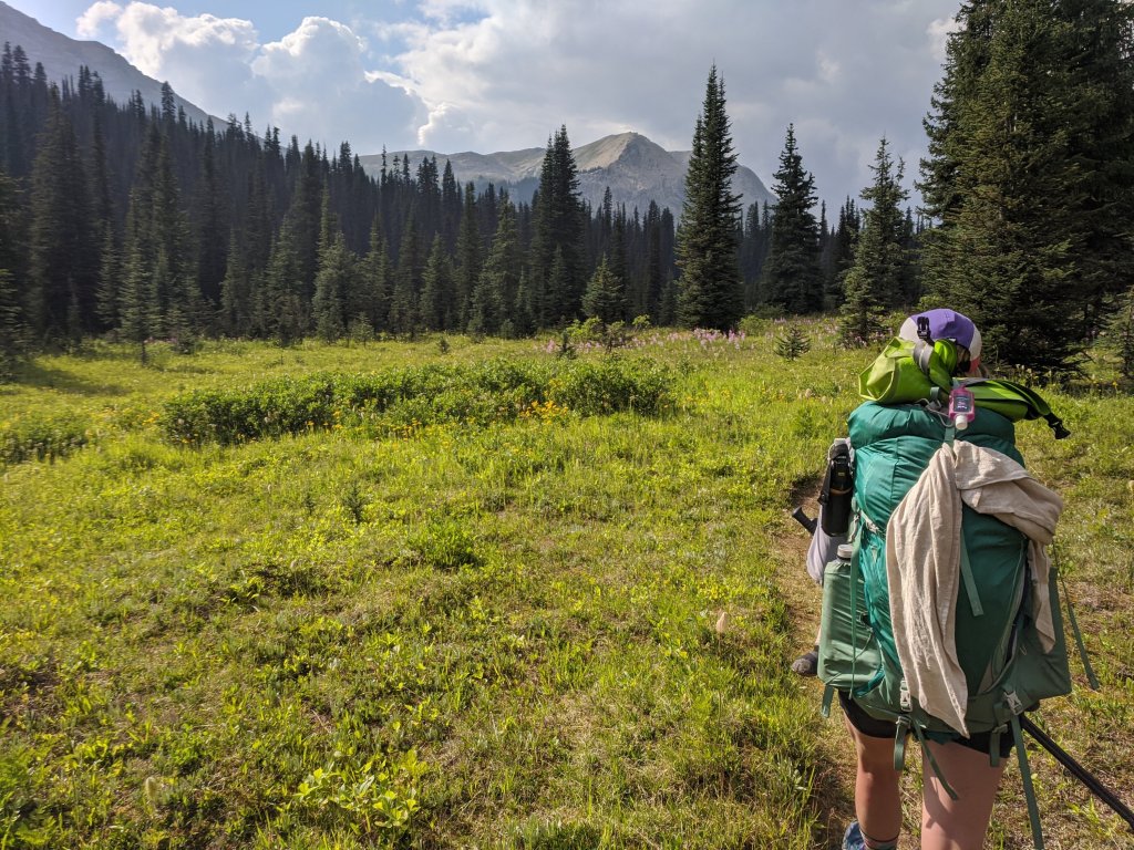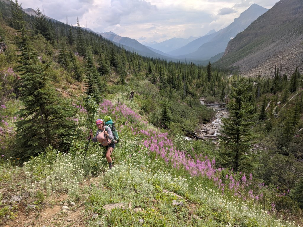 After this point, the trail is still a bit brushy, but nothing compared to the brush earlier that makes you feel like you can’t escape. While washing diapers at a tributary, the sun even started to peak out which was a welcome surprise. We crossed back to the other side of the Amiskwi and some flagging tape appeared (along with some intermittently cut brush). It was mostly good, but a few small brushy sections made me wish we just walked in the river, but those sections had brought us inland a bit, so it was easier to stick with the flagging.