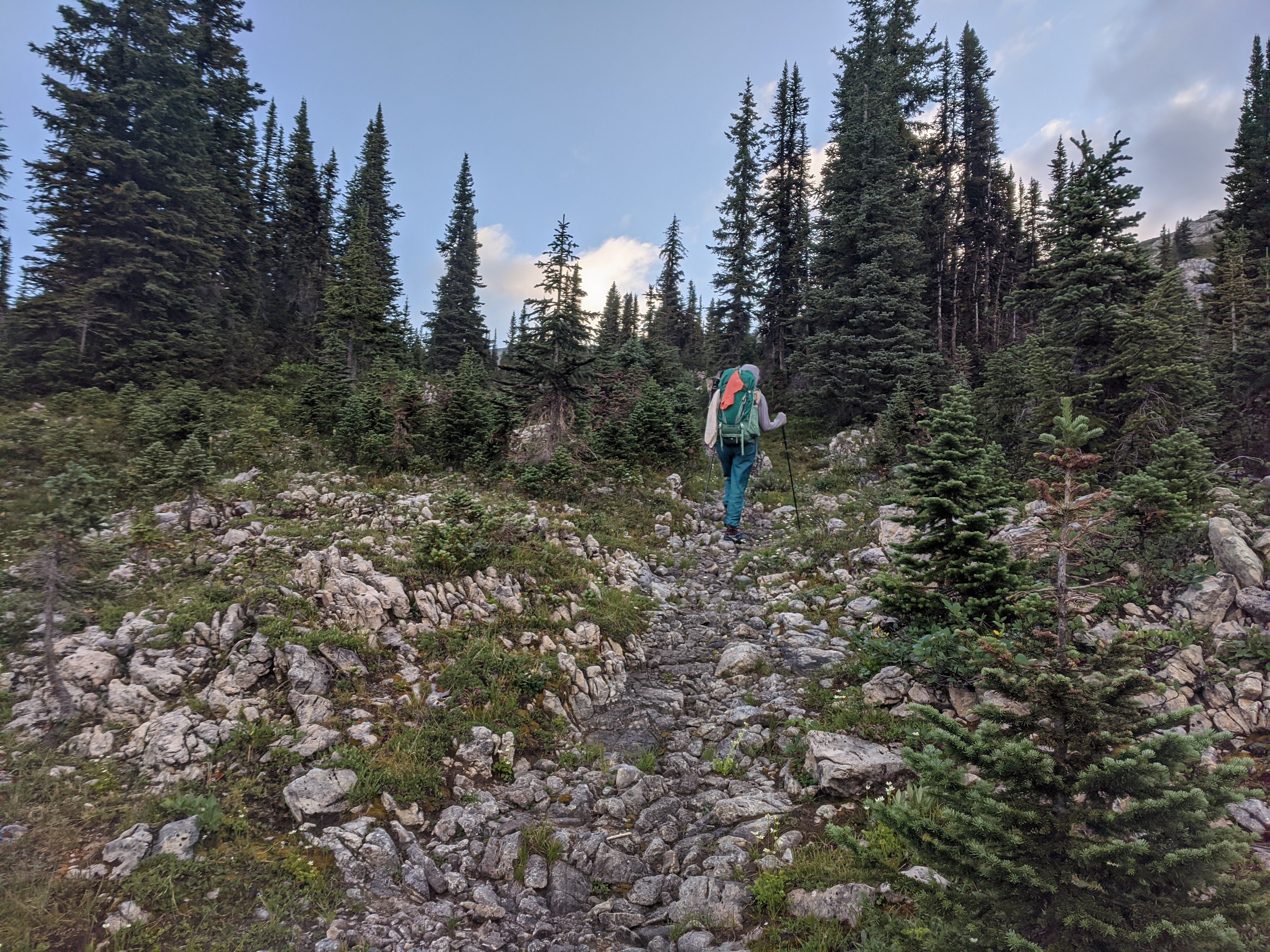 Eventually we had to get off the ridge and head downhill. This is something this alternate thankfully puts off a lot longer than the main route on the road (that’s kinda the whole point!). On the road you spend the whole day descending. On the alternate, the drop off the ridge was initially gentle and the trees spaces far apart so the “bushwack” was not very brushy. Then the walk down is a bit steep (but stable and steady) and you lose elevation quickly.