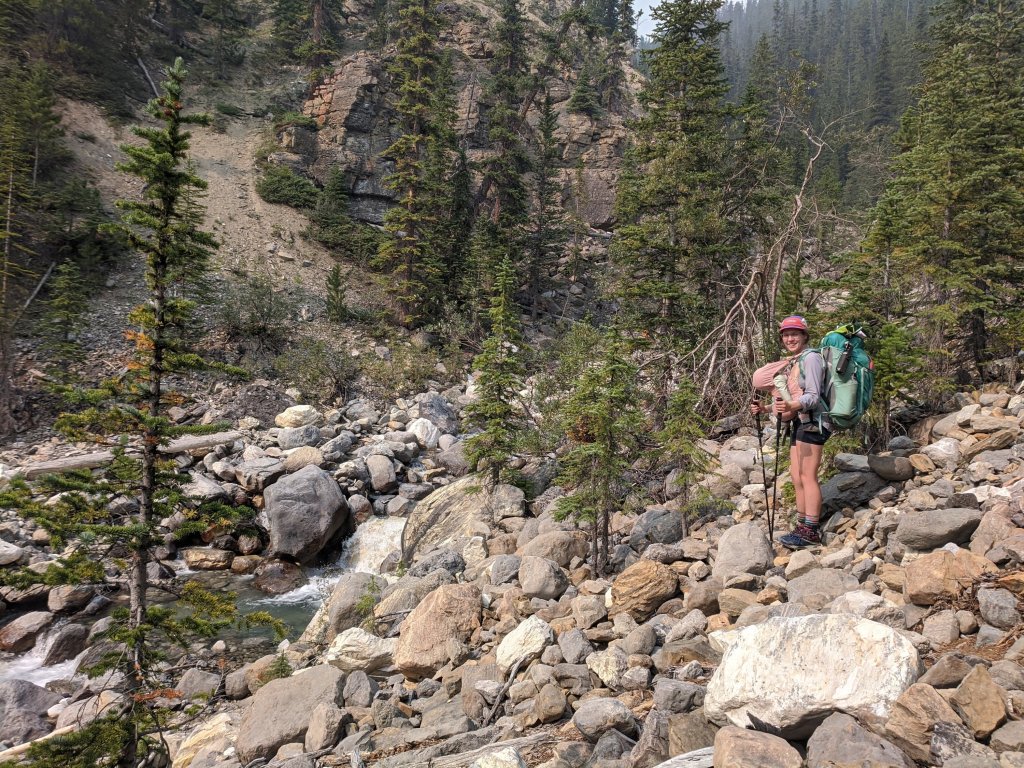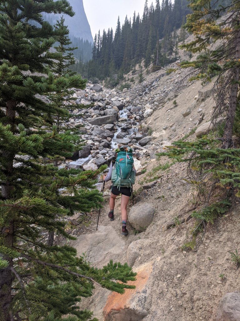 It was hot and smokey and both our bags were heavy – Kyle’s with all our food, and mine with the misc items that don’t fit in his when it’s fully loaded plus a bottle of Fireball to replace the whisky we finished off at Owen Pass in 2018. This meant we were making very slow progress along the trail. There’s no route finding challenges in this section, but it definitely more technical than many other areas. Lots of steep climbs around cliffy sections beside the river, washed out sections of trail and annoying sidehilling, and walking in the river itself when the banks are too steep and/or washed out.