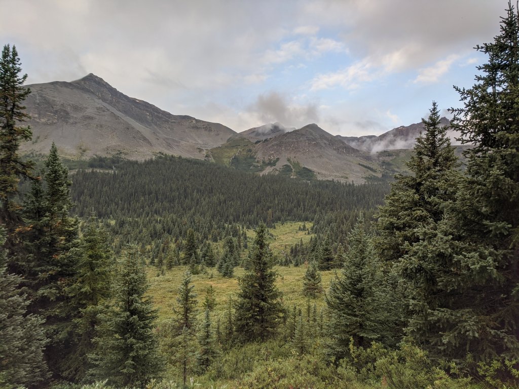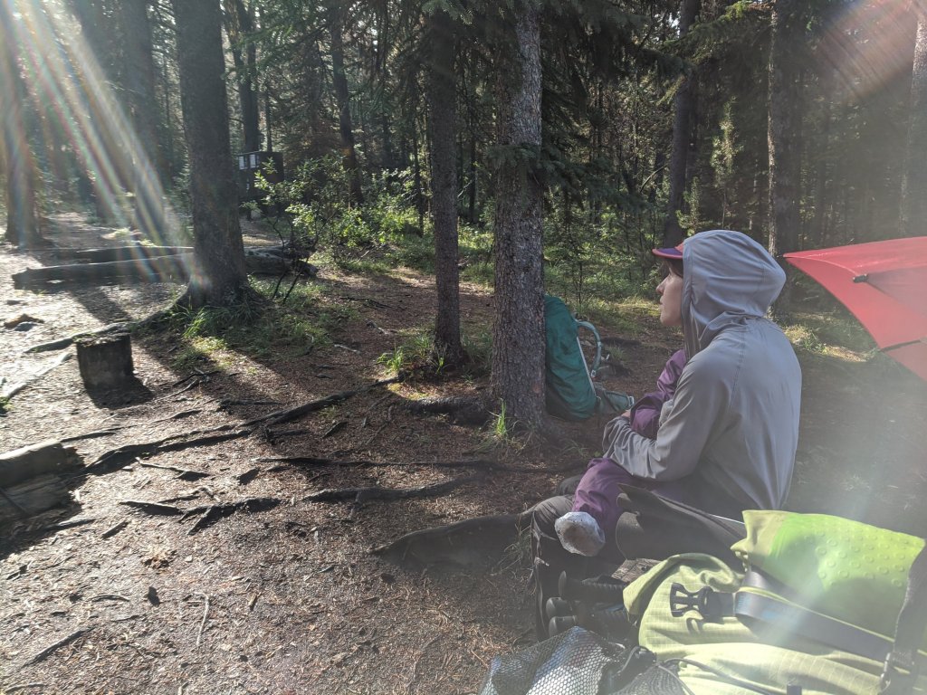 We got to Mary Vaux at around 5:30pm and started setting up the tent and cook in the rain. The campsite is nice with four tent pads of varying quality, green throne, bear hang with hardware, two fire rings and two picnic tables (one of which is sheltered from the rain by large trees).