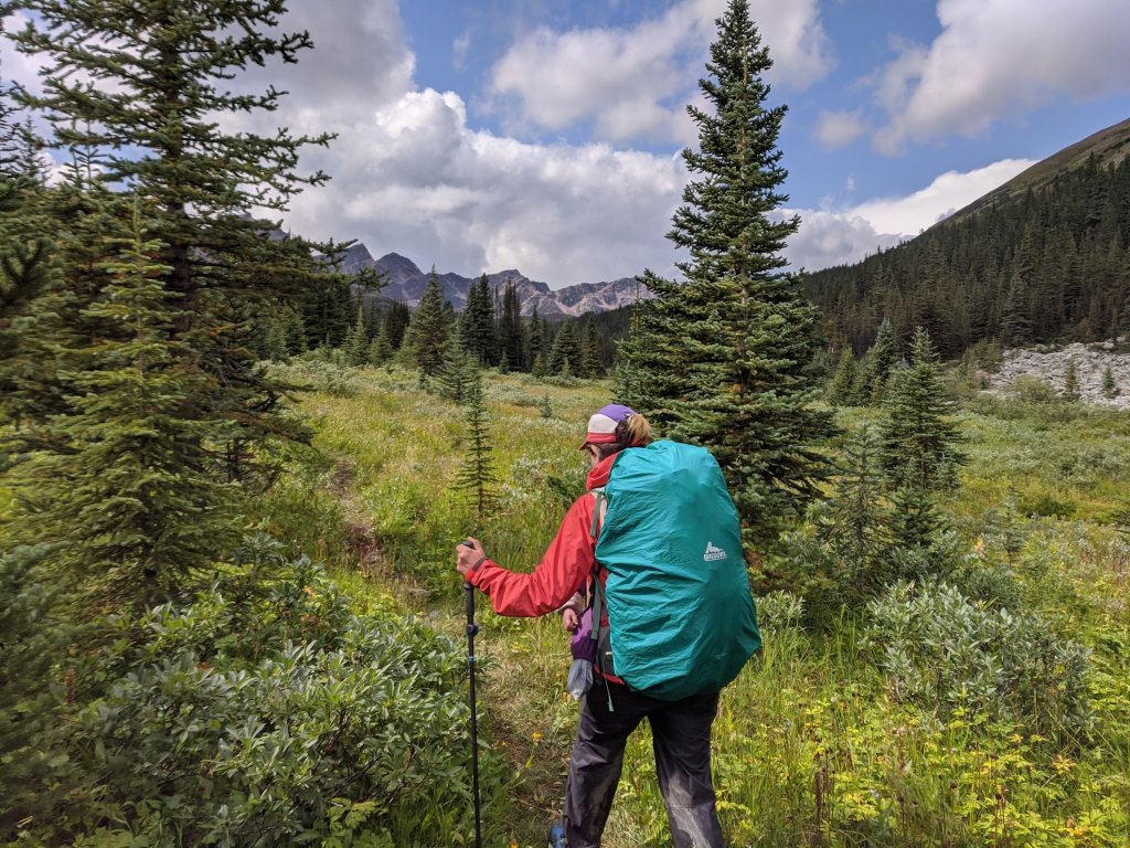 Despite the weather we hiked fairly quickly. The goal was to get to Mary Vaux campsite. Our original plan was to get to Avalanche Campsite, but we realized we could likely get to Mary Vaux today and then to Trapper tomorrow. This plan would reduce our mileage on the following day to 10km. We plan on stopping by the Malign Lake Lodge where we can get cafeteria style food, so a shorter day would give us more time to eat, charge devices and rest!