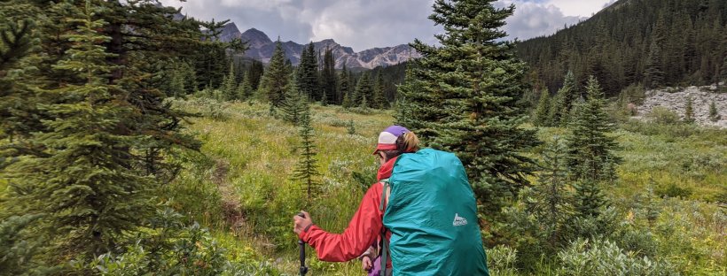 Despite the weather we hiked fairly quickly. The goal was to get to Mary Vaux campsite. Our original plan was to get to Avalanche Campsite, but we realized we could likely get to Mary Vaux today and then to Trapper tomorrow. This plan would reduce our mileage on the following day to 10km. We plan on stopping by the Malign Lake Lodge where we can get cafeteria style food, so a shorter day would give us more time to eat, charge devices and rest!