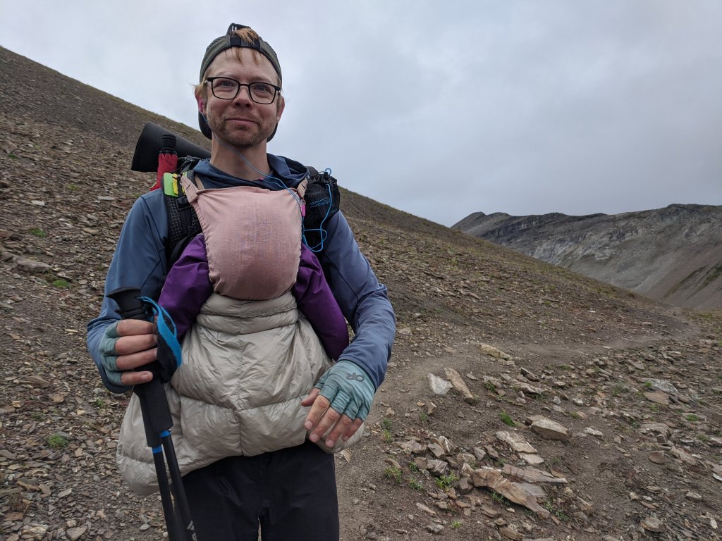 On our way up to Little Shovel Pass we saw a doe and two very curious fawns who seemed fascinated by us before finally following after mom. Up and over the pass and a noticeable chill started to set in and Toothless made us very aware he did not enjoy having to partially disrobe for his diaper change. We pulled out his down blanket to bundle him up in the carrier and then we carried on to descend towards Snowbowl and then up Big Shovel Pass. The portion of blue sky continued to shrink, but the clouds remained relatively high and we still had good views of the surrounding area as we made our way up.