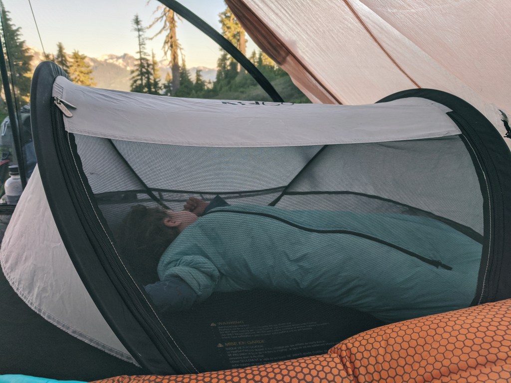I had a brilliant plan that we would attempt to just use a sleeping pad for Toothless to sleep on tonight and not his Peapod as it would be great to cut some weight and volume from our gear list for the GDT. This resulted in a comical situation of a toddler bouncing around the tent and all over us while making no attempts to fall asleep. Plan aborted, we set up the Peapod and put Toothless in it, a few overtired screams later and he was happily asleep in his “crib” for the night.