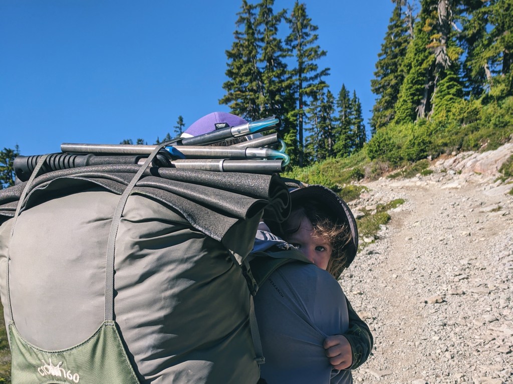 - Some major downsides of this change mean one parent needs to carry the majority of the gear and food, and there’s a big bump in our base weight as these carriers are heavy! The one we opted for is 3.2kg (7lbs) and that doesn’t even include its rain cover.