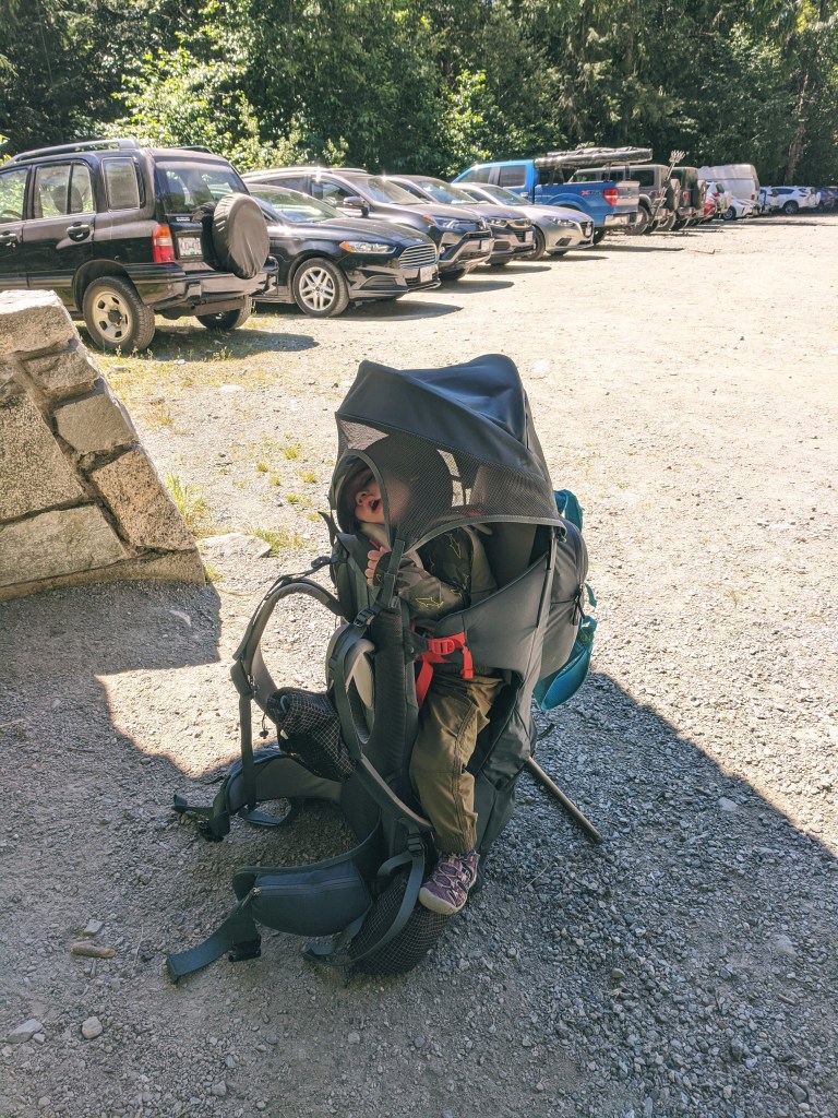 After the swap, the trail is pretty smooth-sailing with Toothless quickly settling into a nap. We stop at the shelter at Red Heather for a lunch break which Toothless once again doesn’t want to eat much of, but he is happy enough once we get on the trail again. Close to the trailhead, he falls asleep again clearly still pretty exhausted from yesterday, so once we reach the trailhead, we put the carrier down in the only patch of shade for him to finish the nap before we start the drive home.