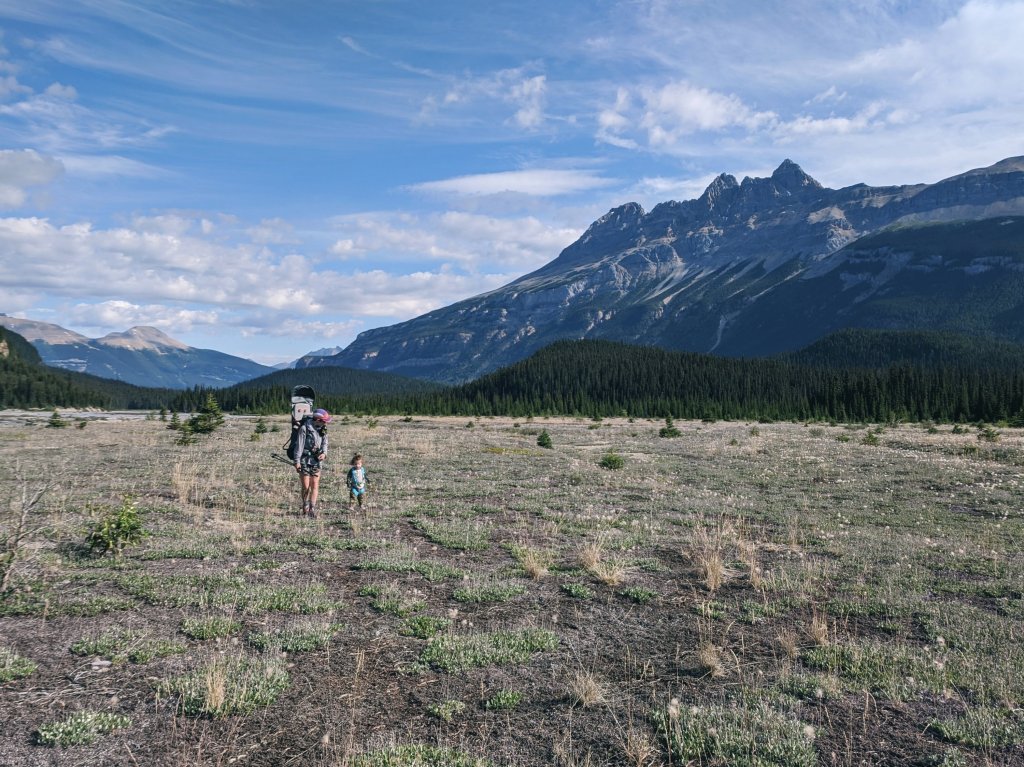 Today the goal is to make it to the Cairnes Creek Rec Site – the same spot we had to get off trail in 2021. Toothless wants to walk when we reach the point where the floodplain opens up again, so we get him harnessed up and down to walk, skeptical about how much forward progress he will make – he seemed to really struggle with the wide Elfin Lake trail and did much better on the single track we were on yesterday. To our surprise, he is quite happy to keep walking forward on the floodplain and doesn’t get distracted by every plant or rock like I was expecting.