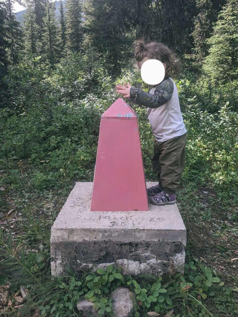 We reach Howse Pass around lunchtime and it seems like a good spot to take a break. All the bugs in the area seem pleased with our decision and join us for lunch as well. At least it is mostly mosquitos that seem to respect bug spray and not those horrible horse flies from the beginning of the the GDT last year. Toothless treats us to some lovely drumming as he discovers the border monument makes intriguing sounds when he bangs on it.