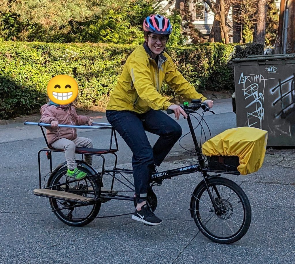 We commute on our bikes and take Toothless to and from daycare on our bikes. I take Toothless to daycare on our Bakfiets and Natasha takes him home on her commuting bike with a Yepp Mini.