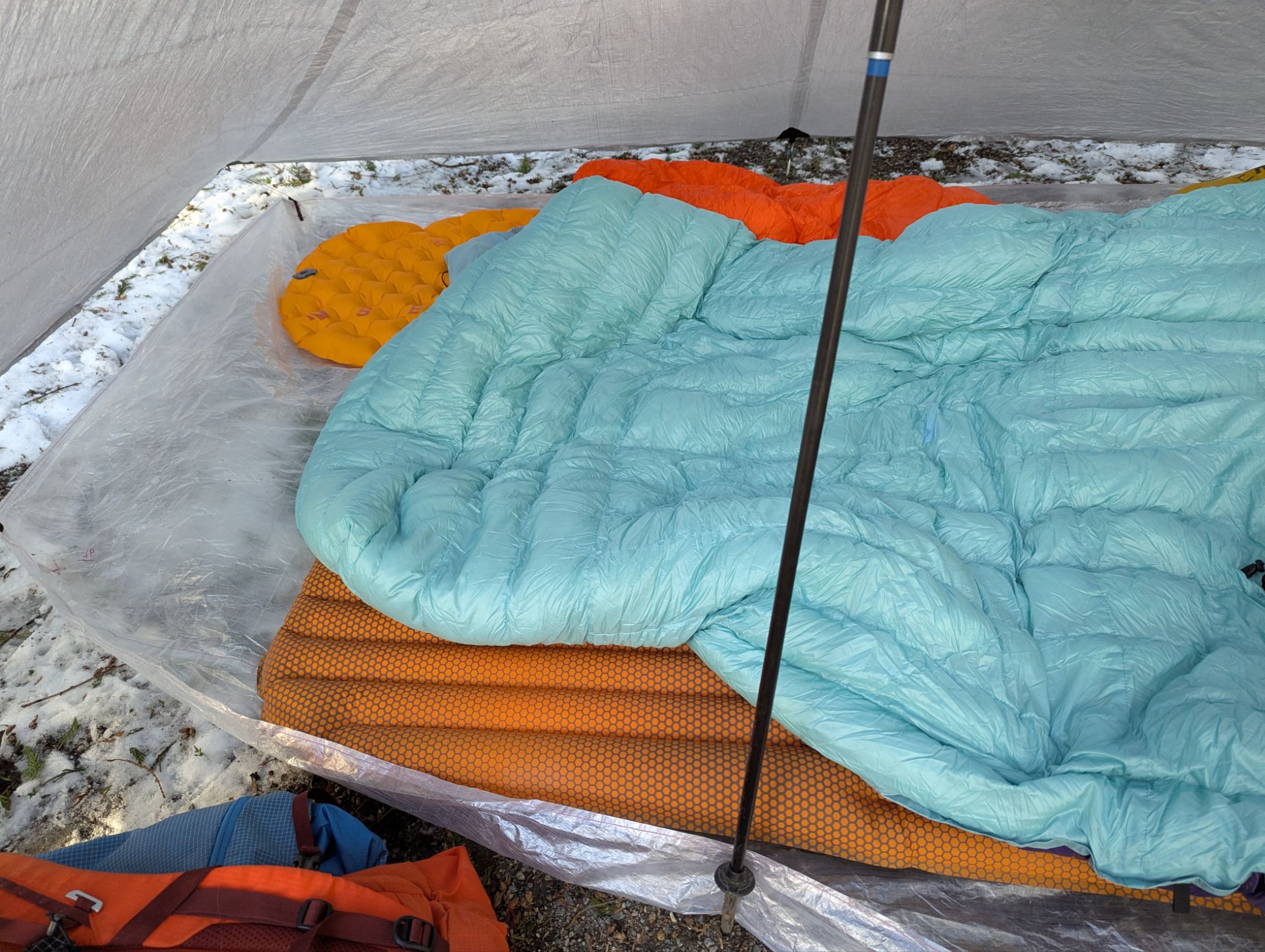 The bathtub floor stayed in place. I was worried it might slide but it didn’t despite the snow. We will see if it holds on a slope. Our sleeping pads and gear stayed inside the bathtub floor. I will stick some loops on the floor so I can use elastic shock cord to hold our pads down in place but so far it is not needed.