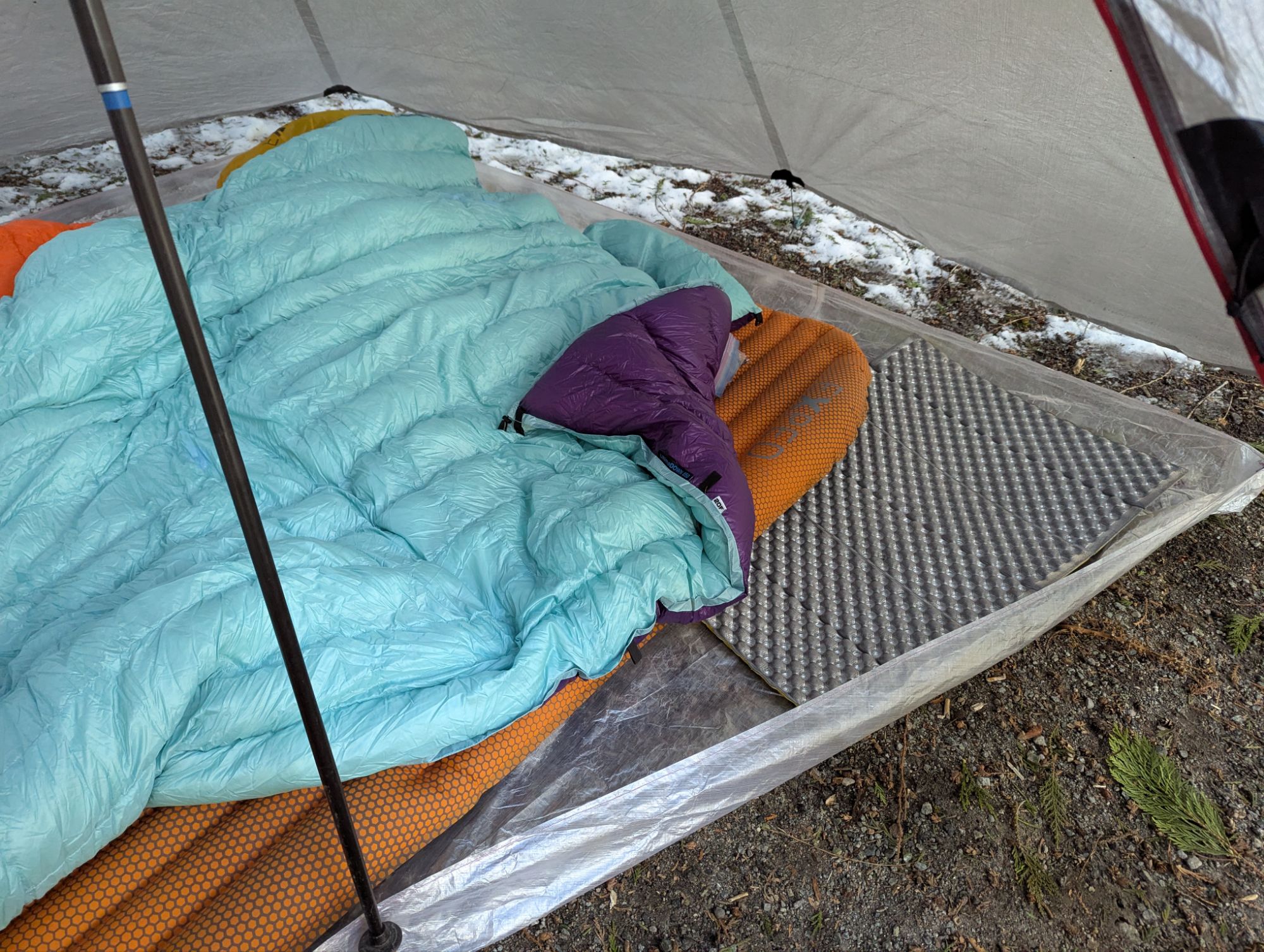 I was warm in my AD90 base layers but wore my puffy to deal with constantly getting uncovered by the quilt due to helping Toothless or Natasha getting up to feed Lil’ Flier. I would have been fine without my puffy without the kids in the tent and I could just stay under the covers. My feet were hanging over the edge of the pad due to how the pad was set up and were cold. I might need to try to reposition the pad or put something under my feet or wear warmer socks. The footbox or our old rayway quilt was a box closed so it was resilient to falling off the pad. I might need to tie the foot of our new quilt closed to box it in.