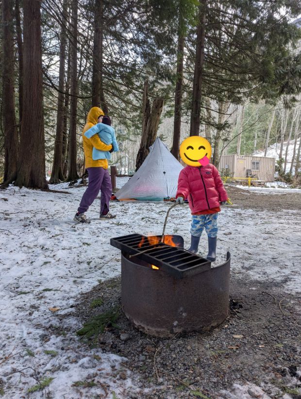 We arrived just as the kids fell asleep in the Jeep so of course they promptly woke when we pulled in. We set up the tent and sleep gear. There was a bit of snow but we found a partly clear spot to set the tent up. We had to use a hammer and stakes to get through the hard surface. This made pitching more challenging – readjusting a peg position is more effort than it should be despite the flat surface. A good test of being limited on where you can put the tent pegs to see how clean of a pitch you can get. I clearly need more practice.