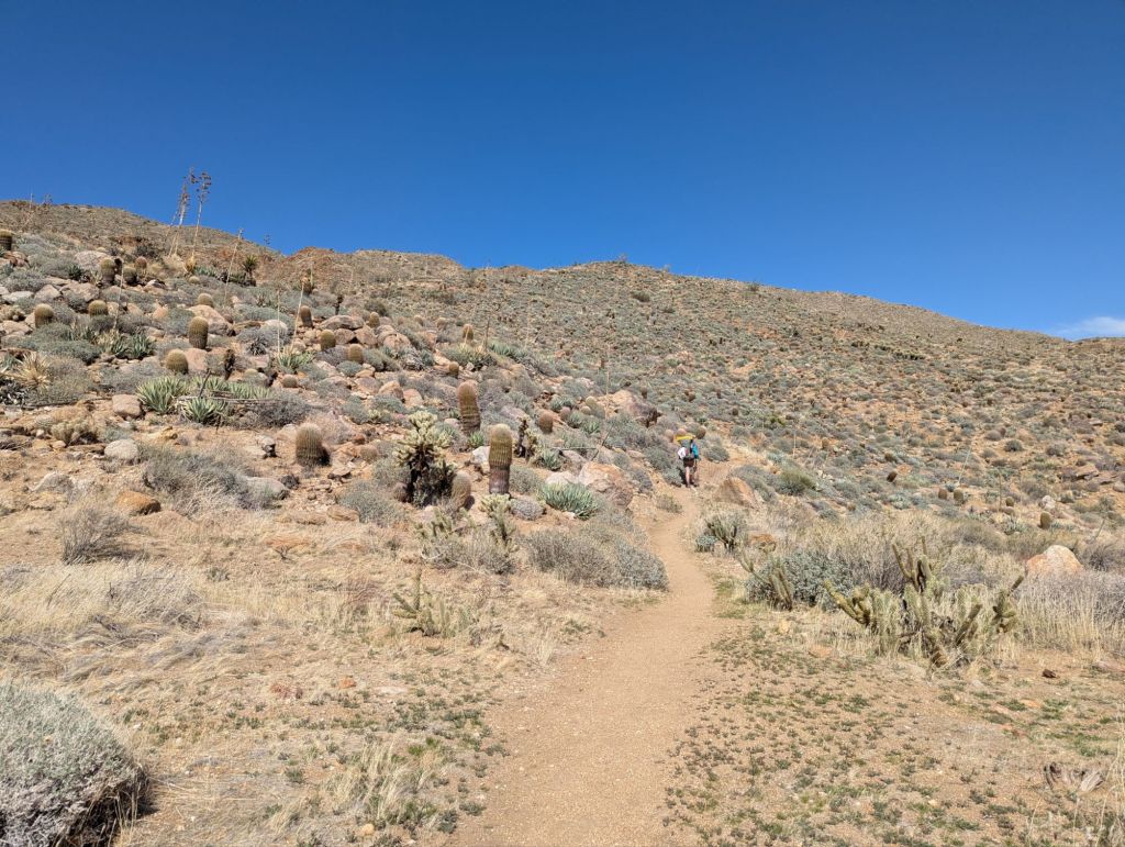 Keep on trekking, kids! Look for funny shapes in the vegetation! You seem to be in the territory of cactus that look like people, from afar!