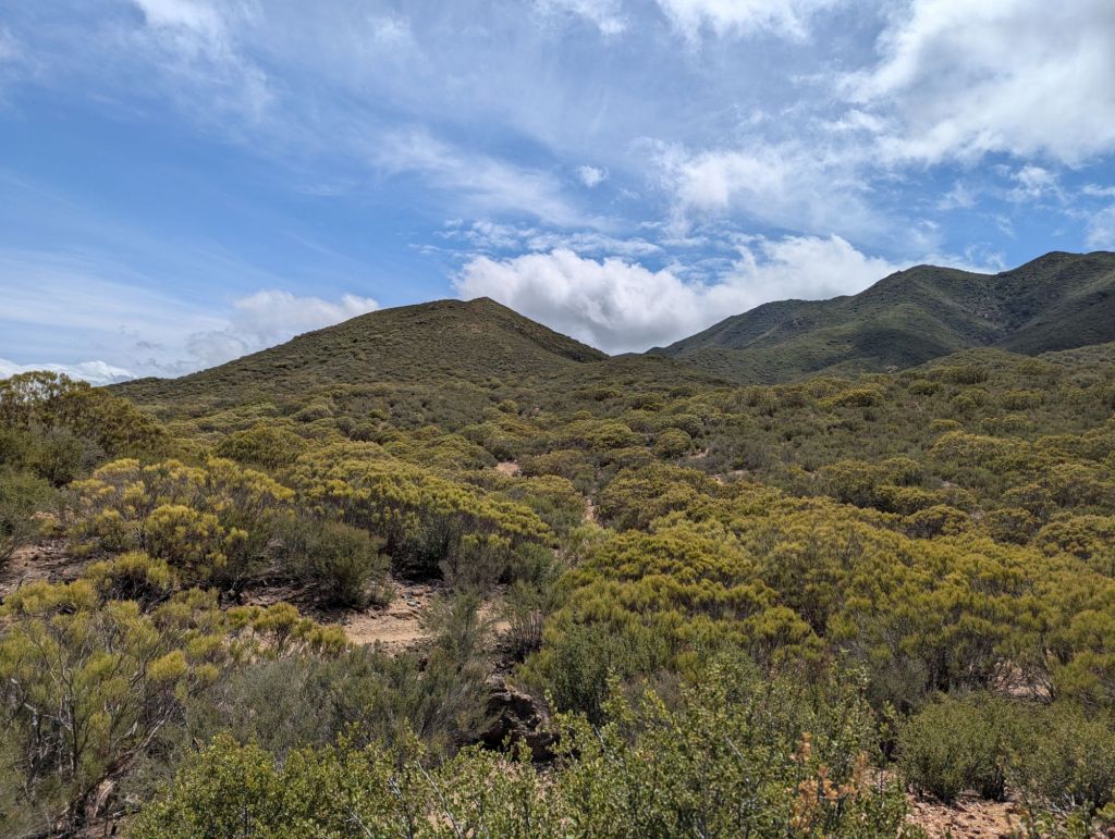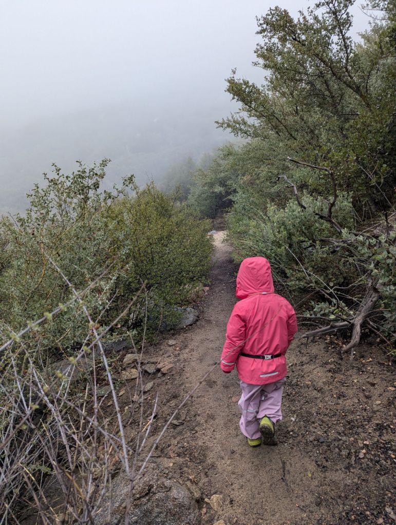 We wore rain gear. Natasha and I brought our rain pants (a last minute decision – we probably would not have brought them to SoCal if we were hiking without kids). So we wore rain pants and jackets. The kids wore their down jackets with their rain gear on top. Lil Flier wore her fuzzy fleece jumper and Toothless wore his wind pants under the rain buntings. Toothless gets bread bags in his trail runners. Lil Flier gets ziplock bags over her feet. They stayed cozy.