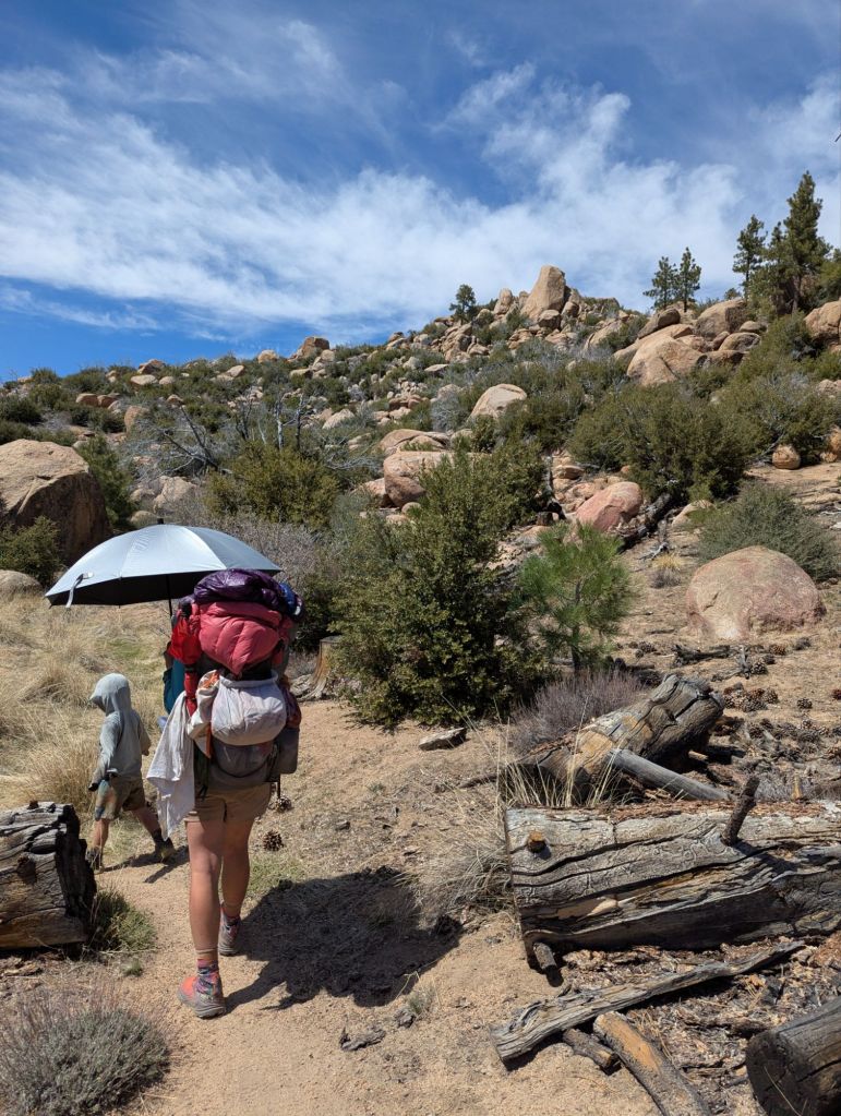 We found a site near a creek. We don’t need water but it was our only option for a while. It’ll be cool at night but the site had a nice spot for eating dinner. The tent site is sloped so I we able to shift the sand around to level it out. It feels flat but we will see.