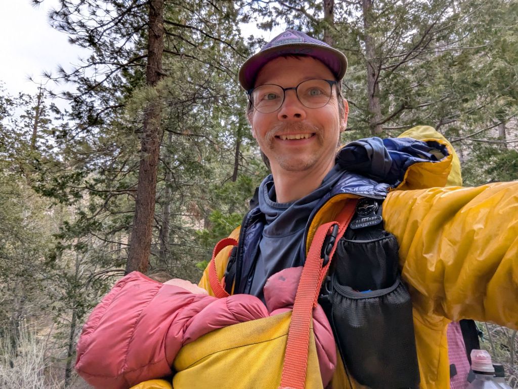 We got to Sulfur Spring camp at like 3pm and no trail magic. We had a break and swapped kids. Natasha tried putting Lil Flier facing forward and we hiked another mile or so to a nice site on top of a hill. Quiet. Plants nearby to block wind. We are in the tent getting rain but thankfully our gear did get dried out earlier so we are cozy. Before bed Secret and I played “kitty” which is basically him riding my back.