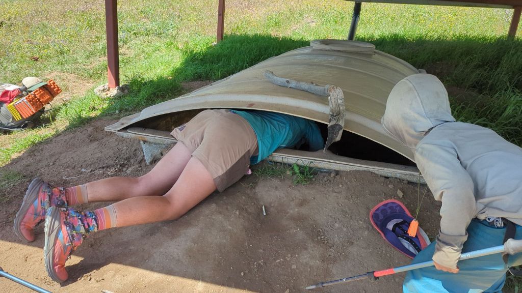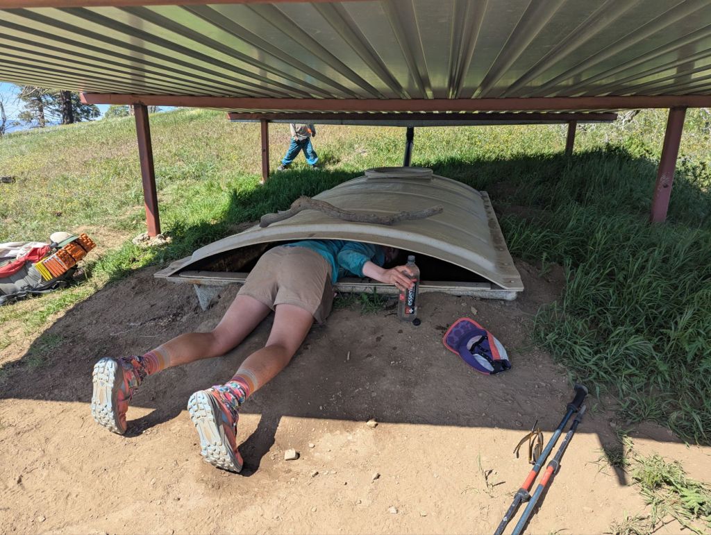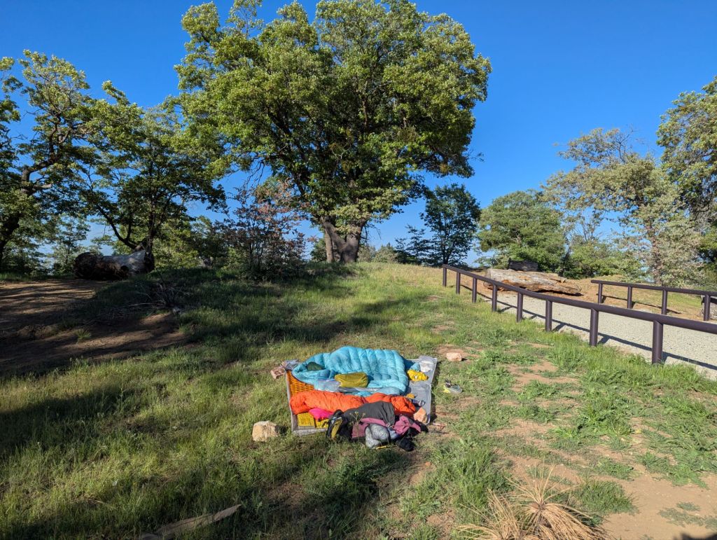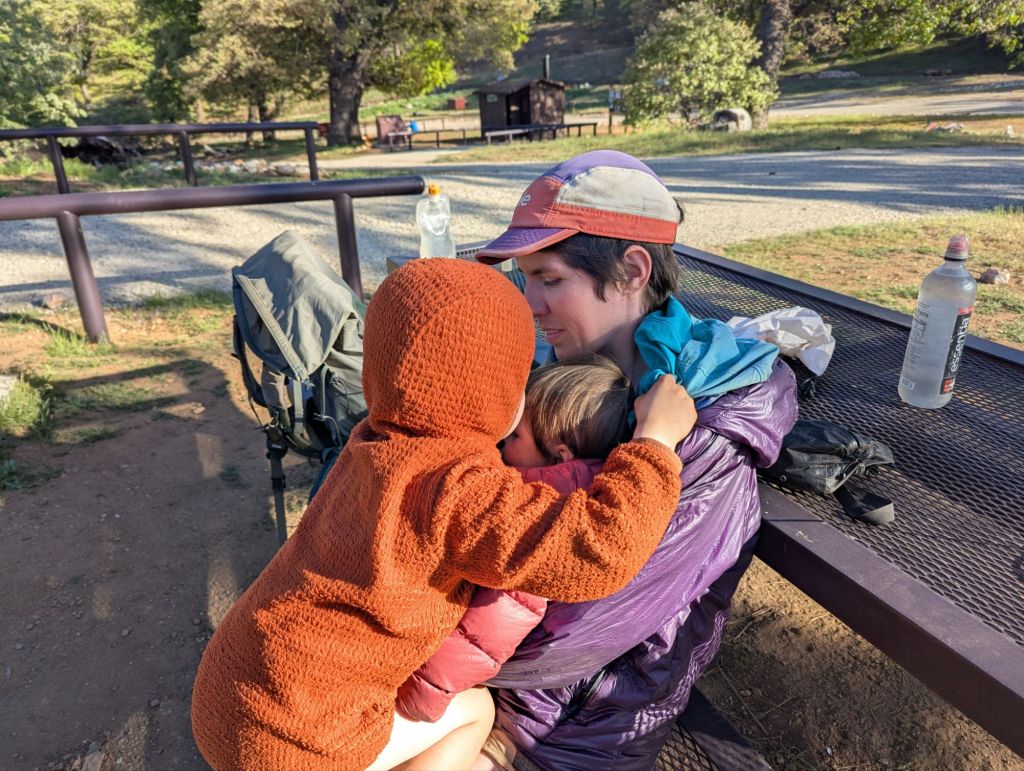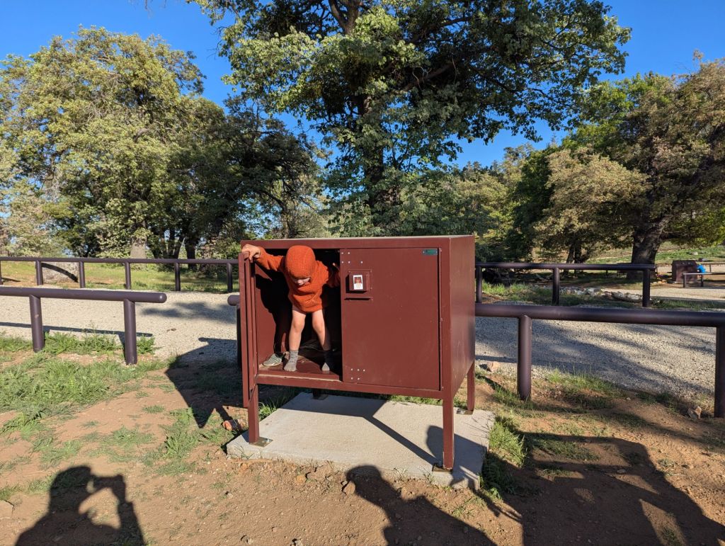 The camp was nice. We were one of three groups there. We picked a spot within sight of the toilets and decided to cowboy camp. Secret played around camp. We read stories. He climbed into the bear lockers. We had some (amazing) gluten free ramen bombs.