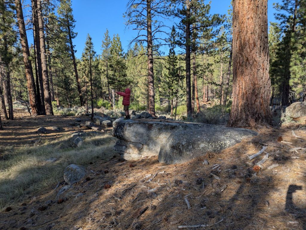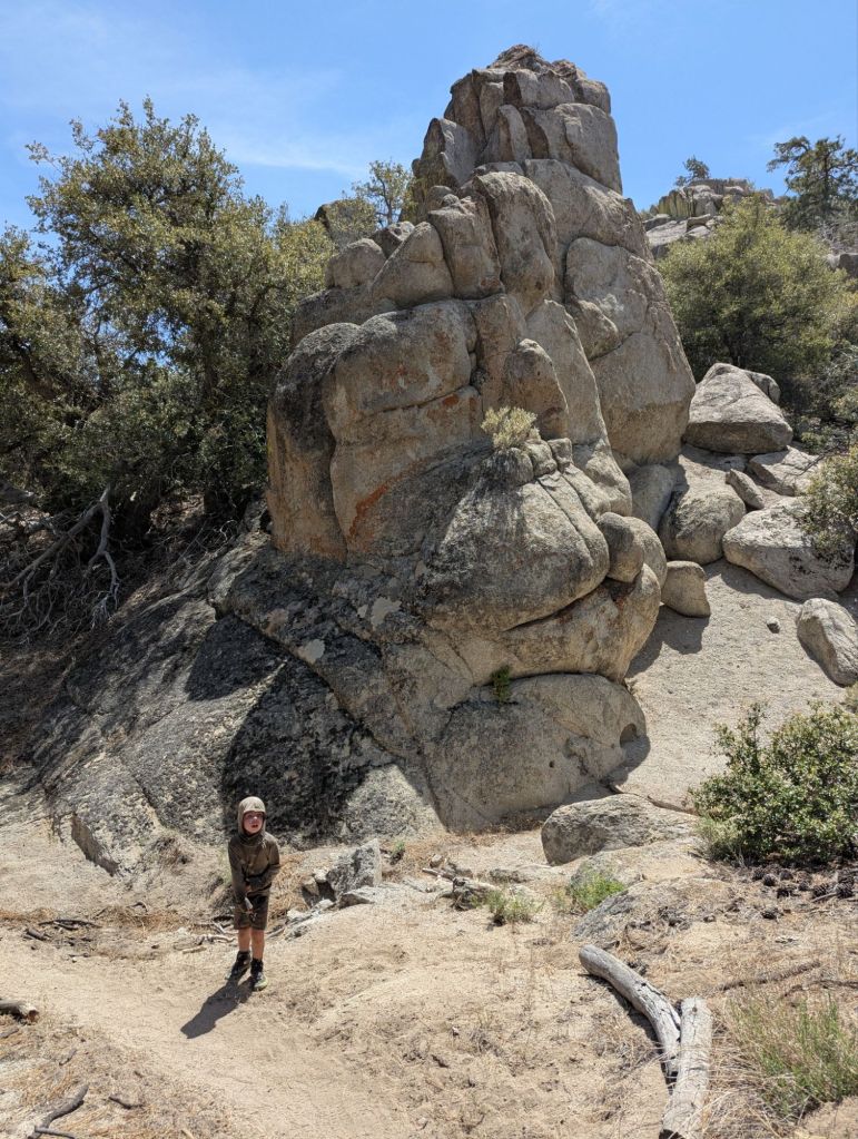 We had lunch with gummy bear and possum. Gummy bear is another kid on trail as long as she can be – similar constraints for the end. She starts her next school year in Sept. Secret spent lunch climbing boulders. He’s going to love the Sierras.