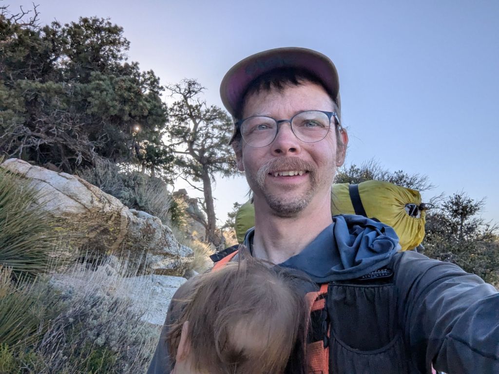 Pretty okay day. We went to a cabin and piped spring for the night. Also a very popular spot. The kids were popular. We found a spot to camp far away from the cabin so we don’t disturb anyone (and to give us privacy). It had boulders for Secret to climb. We set up the tent using boulders to hold the guy lines.