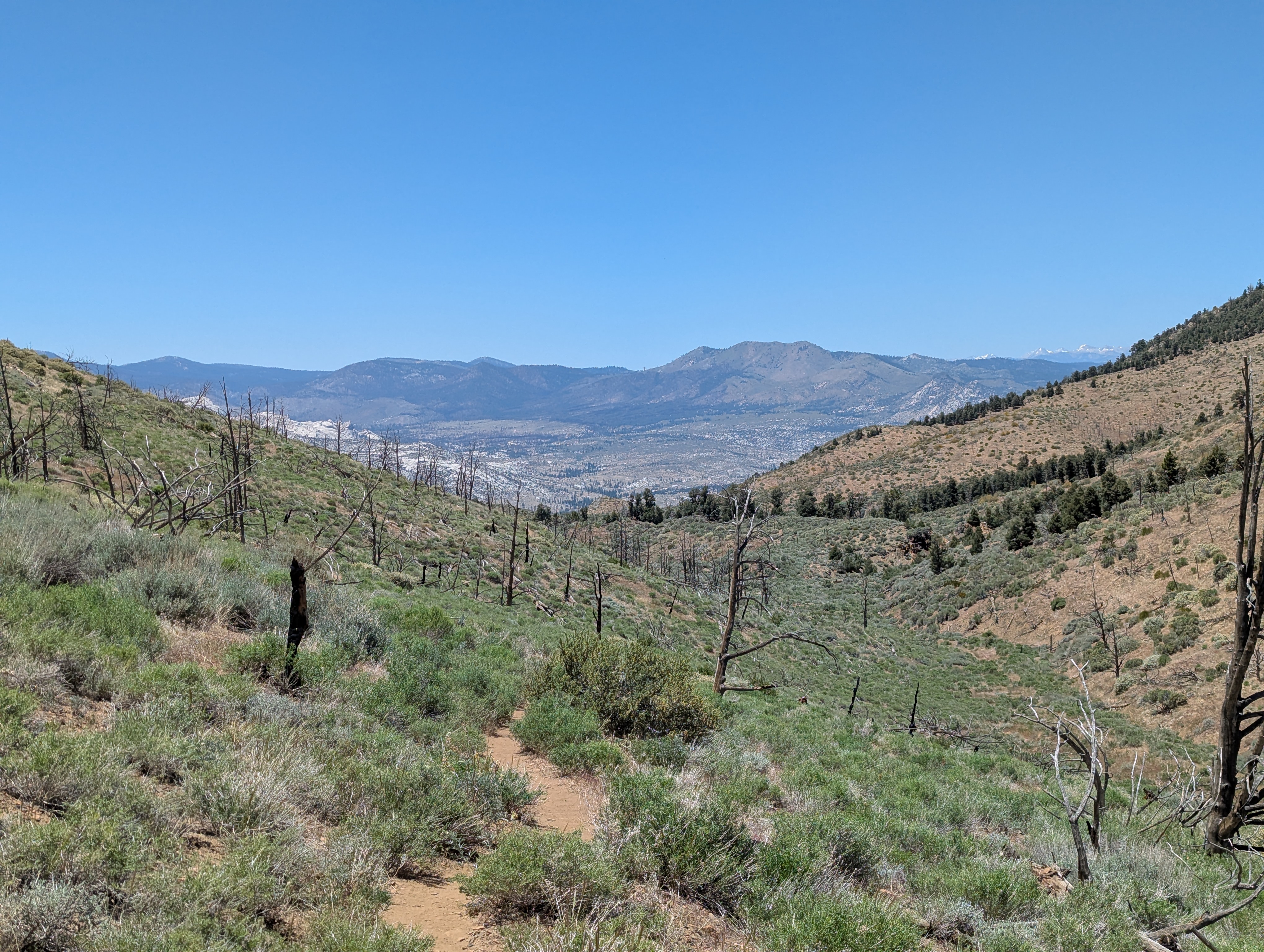 We did lose our shade in the afternoon but some of it came back and we finished by climbing down a valley with a view of the meadows and white granite mountains.