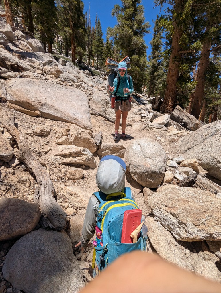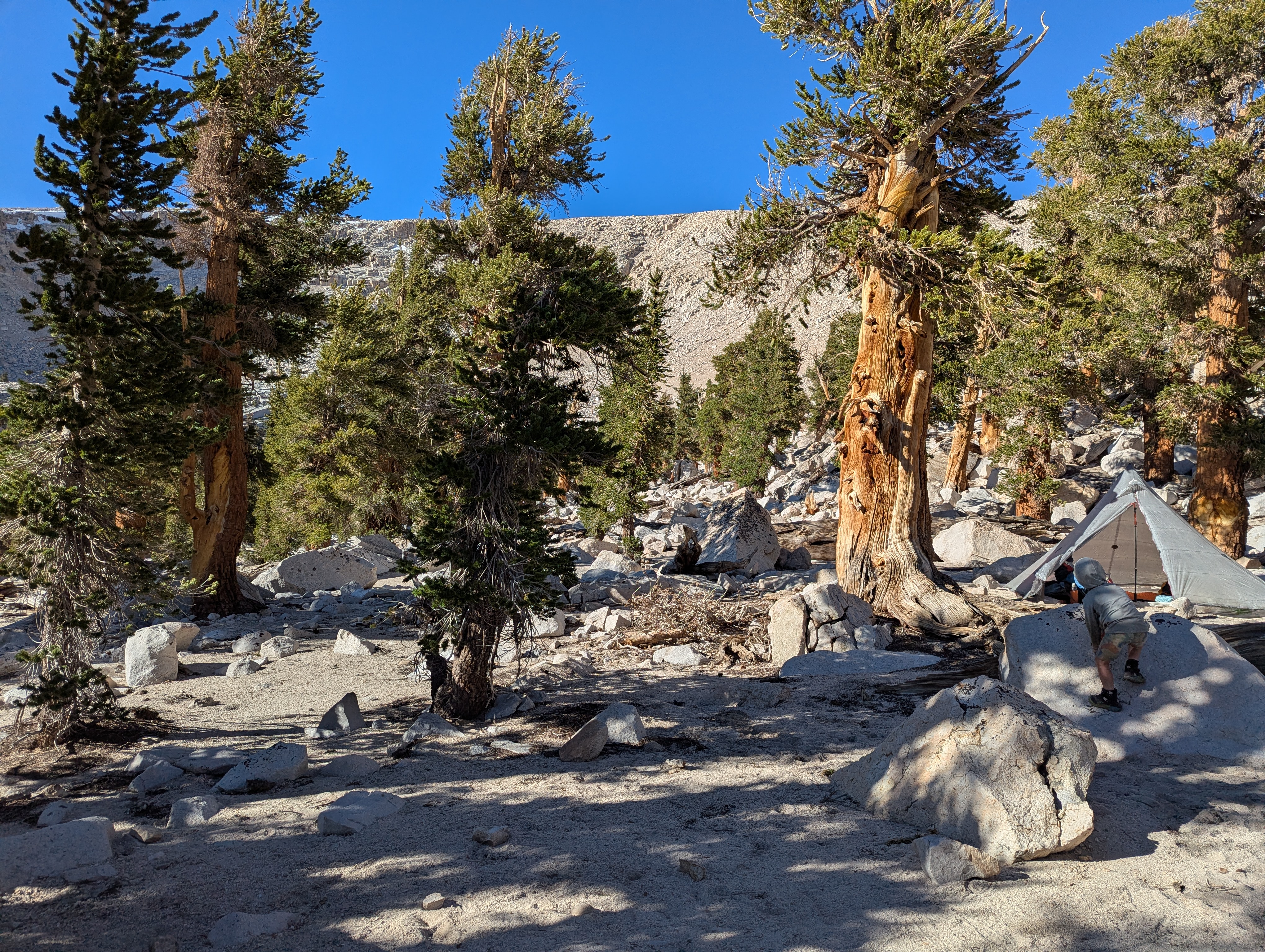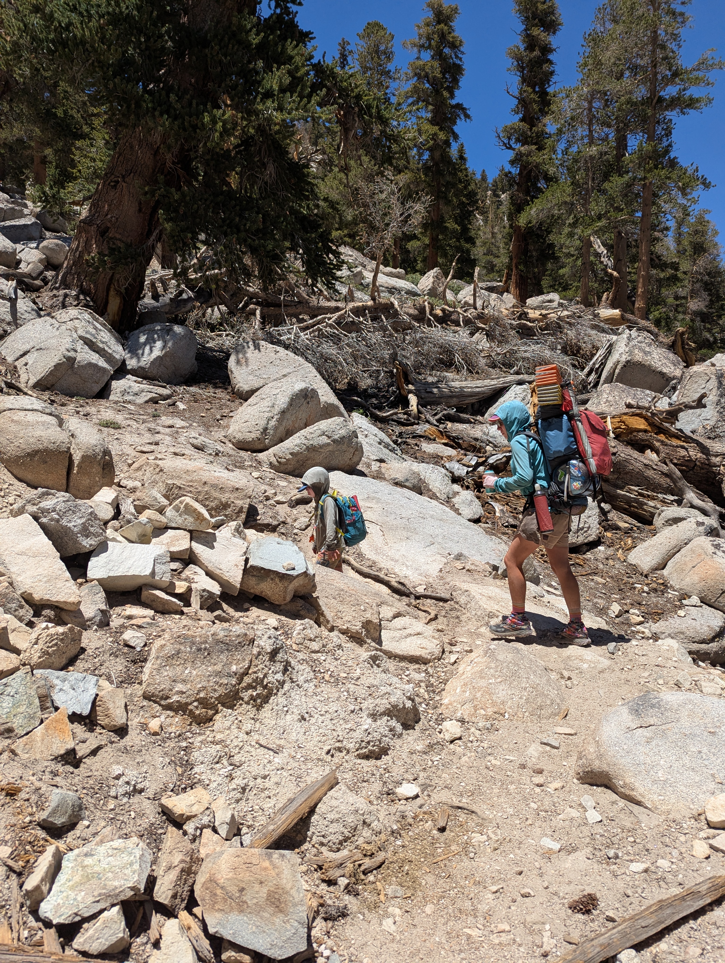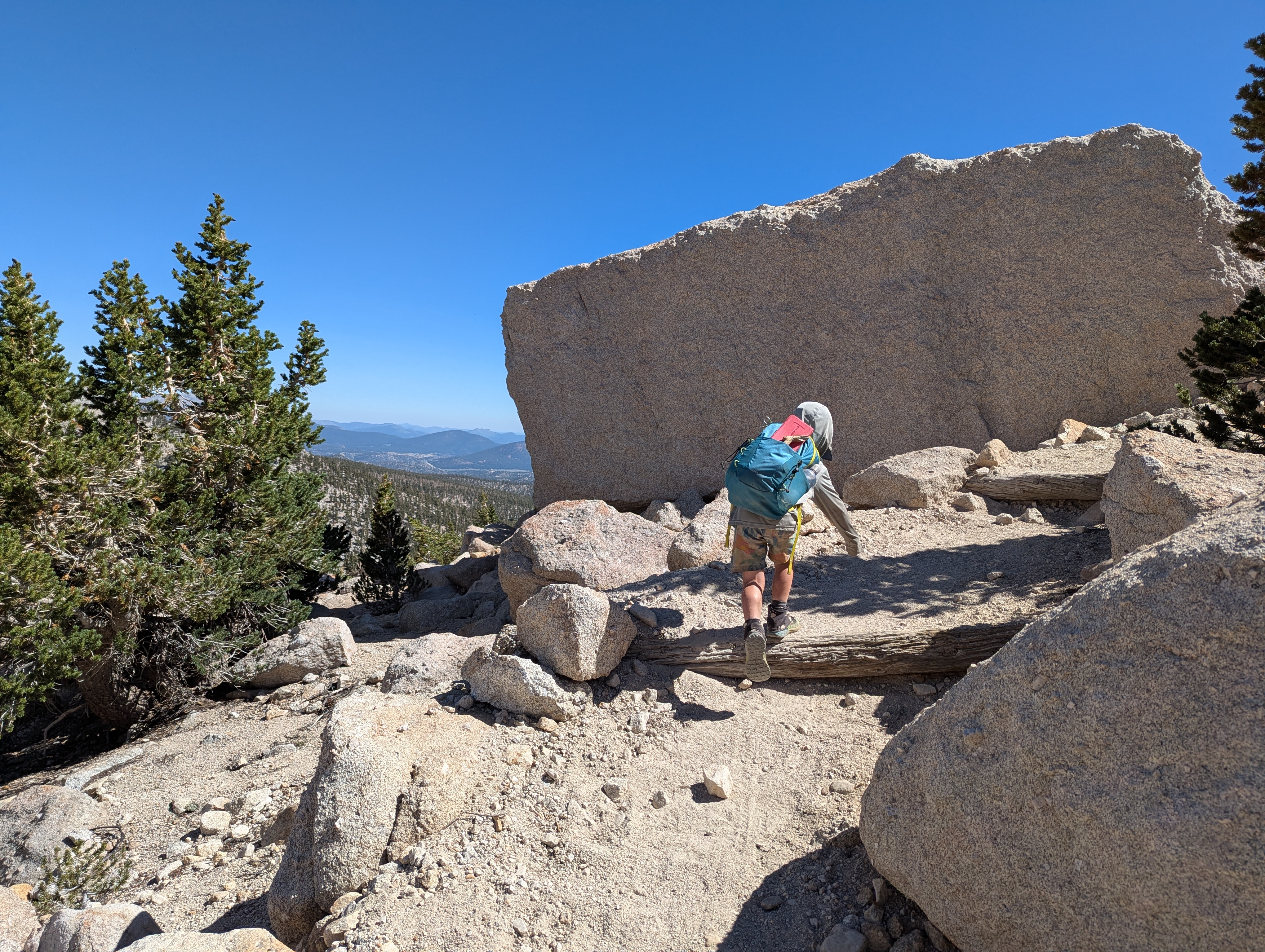 We eventually found a nice spot a little close to the trail before the next lake. We figured we’d camp there instead of the site listed on Farout to avoid any crowds. It’s pretty here. Lots of climbing opportunities for the kids. The tent site I picked was very flat. It’s not near water so we won’t have to deal with the condensation.