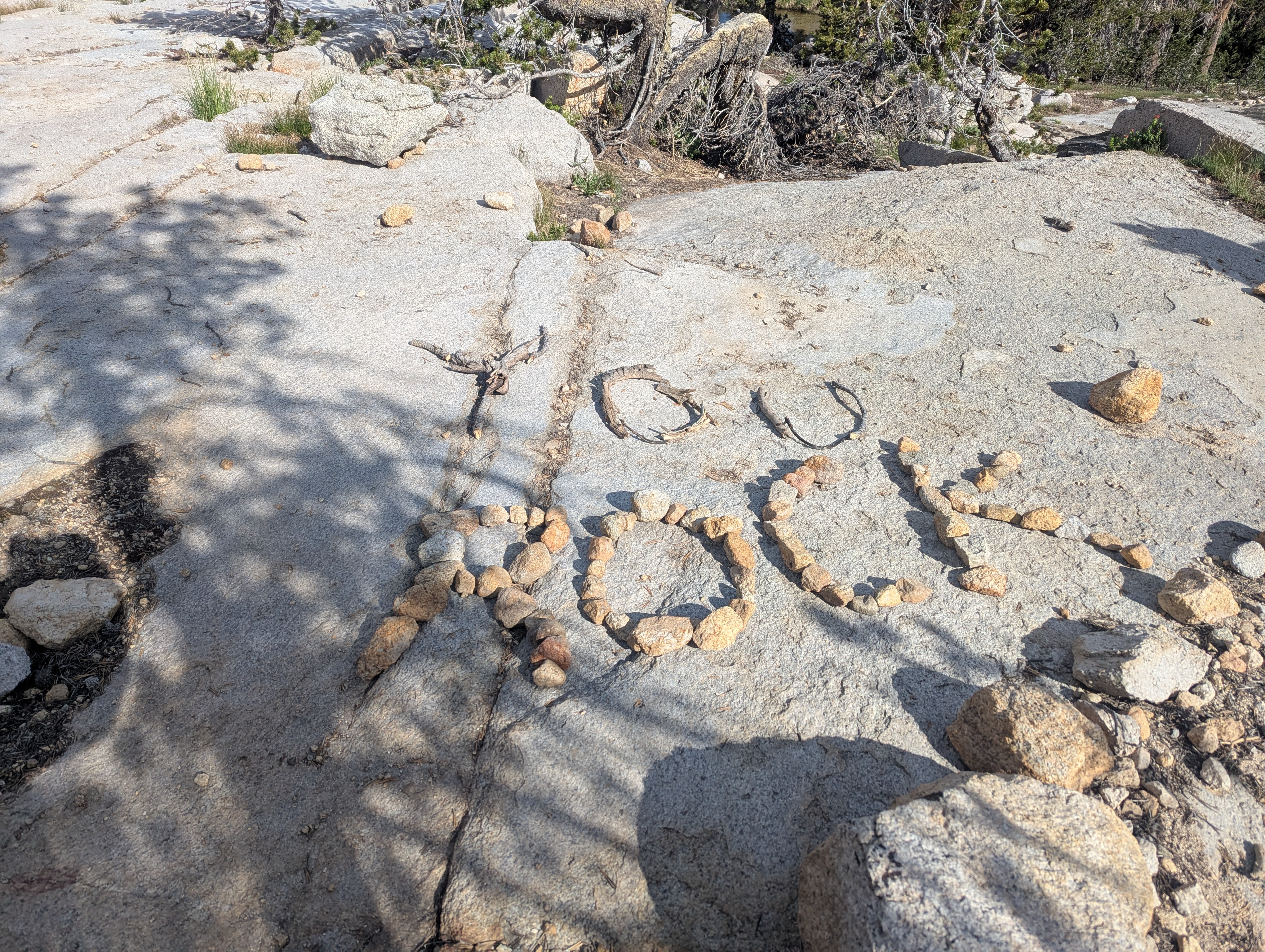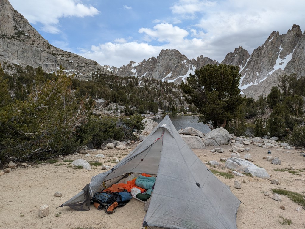 As we pulled in to the lake some scouts came in. Another group of backpackers told us the spot with their bear can on it is open – they just didn’t want the scouts grabbing it. So we got a pretty flat spot by them, boulders and the bear lockers.